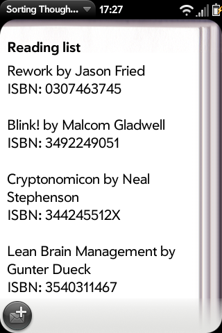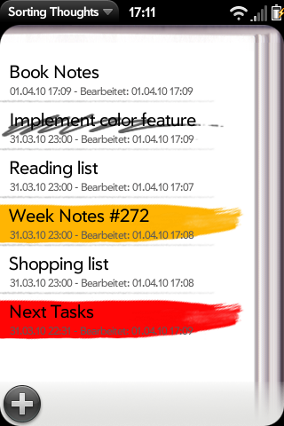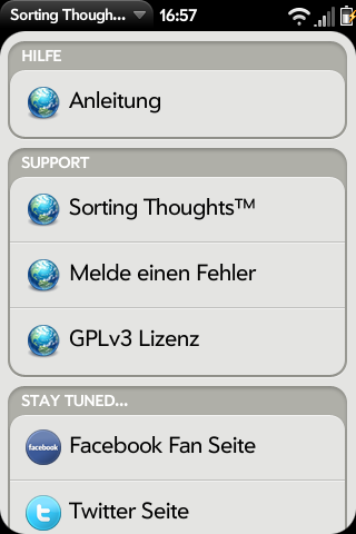 Wenn Du ein HP Palm webOS Geräte besitzt, ist Sorting Thoughts für webOS™ die ideale App für dich, um deine mobilen Gedanken zu sortieren. Und das Beste ist, mit der Desktop Version von Sorting Thoughts ist es möglich seine mobilen Gedanken zu sichern und zu synchronisieren.