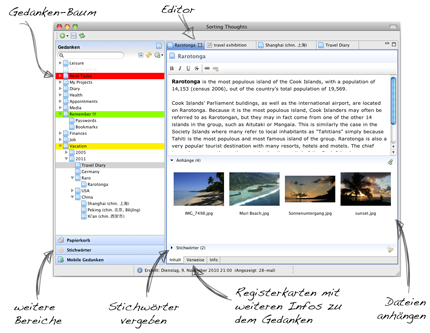 Mit Sorting Thoughts kann man auf einfache Art und Weise seine Gedanken sortieren. Es lässt sich hervorragend als Tagebuch, Aufgabenplaner, Noitzverwaltung, Persönliches Wiki oder Brainstorming-Werkzeug nutzen. Zusammen mit der webOS App von Sorting Thoughts lassen sich auch mobile Gedanken verwalten und synchronisieren.